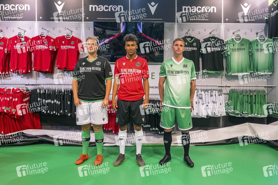 Anna-Lena Füllkrug, Linton Maina und Niklas Tarnat bei der Präsentation der Hannover 96-Trikots des neuen Ausrüsters Macron für die Saison 2019/20 in der HDI Arena. Hannover, 16.06.2019