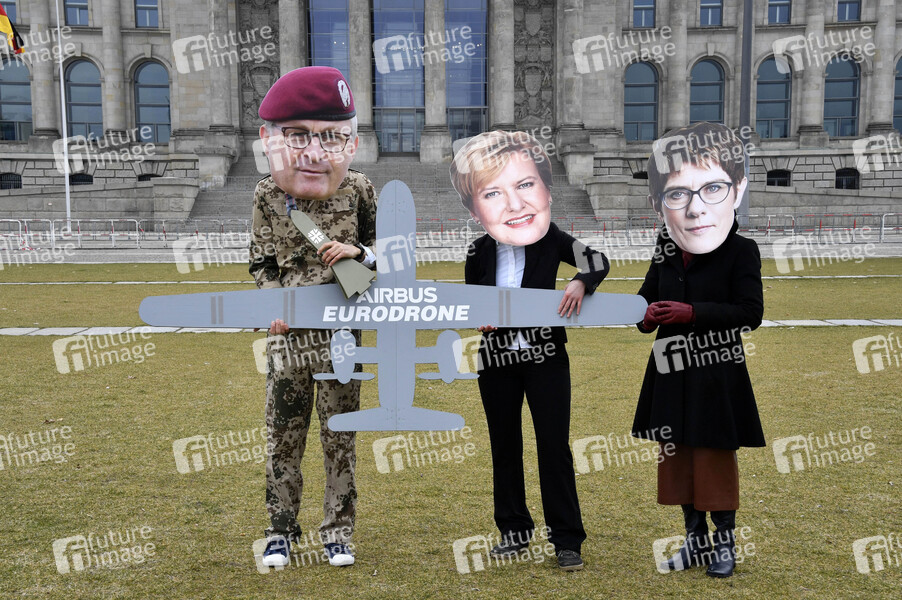 Reichstagsgebäude, IPPNW Deutschland, DFG-VK, Aktion, Demonstration, Abrüstung, Demonstranten, Aktivisten, Protest, Protestaktion, Eurodrohnen, Kampfdrohnen, Masken, Annegret Kramp-Karrenbauer, Eberhard Zorn, Eva Högl