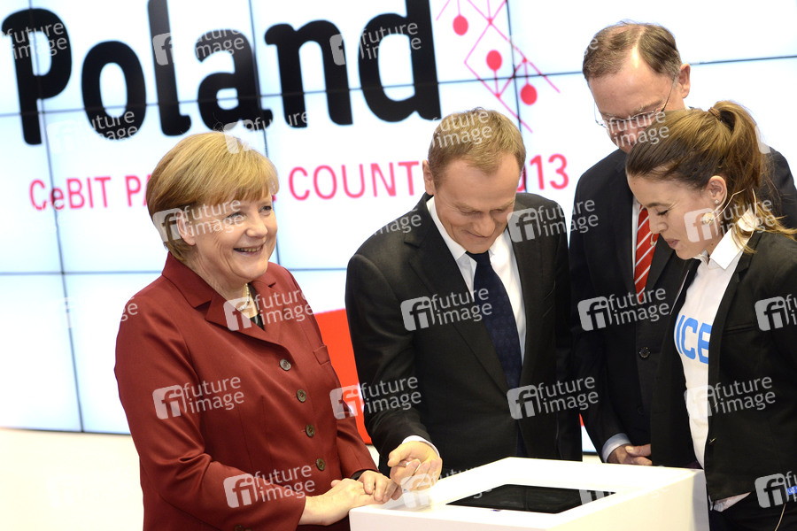 Angela Merkel und Donald Tusk beim Eröffnungsrundgang auf der CeBIT 2013 auf dem Messegelände. Hannover, 05.03.2013