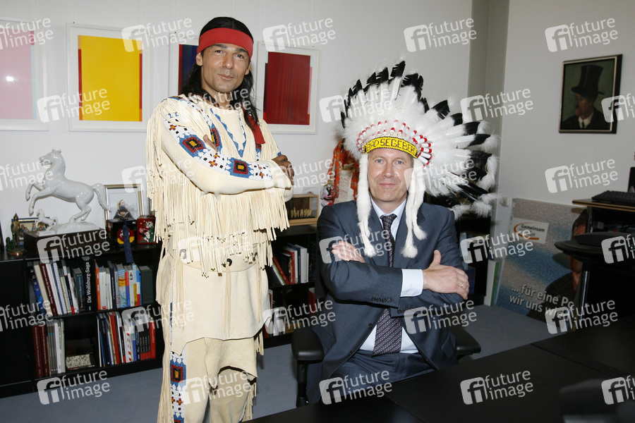 Das Ensemble der Karl-May-Spiele 2009 nimmt Ministerpräsident Wulff in den Kreis der Ehrenhäuptlinge auf. Dazu fanden sich die Mitwirkenden von 'Der Schatz im Silbersee' in der Niedersächsischen Staatskanzlei in Hannover ein.