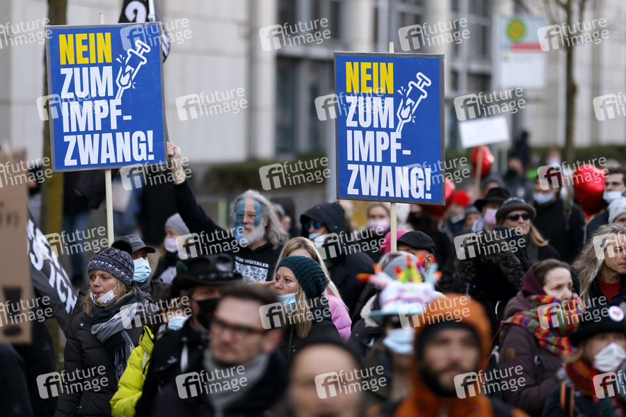Bei einer angemeldeten Demo unter dem Motto 'Wir alle gemeinsam - Freie Impfentscheidung' demonstrierten etwa 12.000 Gegner einer Impfpflicht mit einem Spaziergang gegen die Corona-Maßnahmen der Bundesregierung und für eine individuelle Impfentscheidung, Grundrechte und 'unversehrte' Kinder - darunter auch viele Pflegekräfte, die wegen der Impfpflicht im Gesundheitsbereich ihren Job zu verlieren drohen. Düsseldorf, 12.02.2022