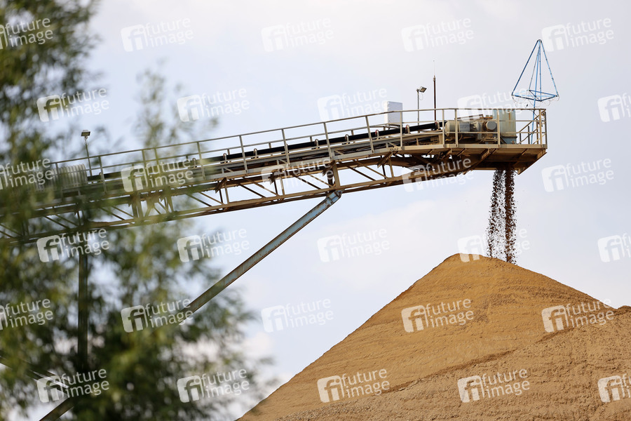 Aushub, Abbau, Sand, Sandgrube, Baustoff, Baustoffe, Sandwerk, Sandberg, Sandberge, Sediment, Mineral, Mineralien, Mineralkörner, Kieswerk, Kiesgrube, Quarzsand, Quarzsandwerk, Quarzkörner, Förderband, Sandsteinbruch, Körnung, Sand kaufen, Sandhandel, Bauindustrie, Rohstoff, Rohstoffe, Symbolbild, Symbolfoto