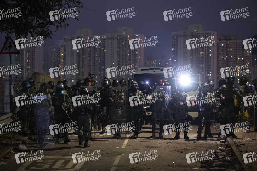 Polizei an der No. 2 Bride, die in die Universität führt - Kampf an der Chinese University Hong Kong (CUHK). Hongkong protestiert seit fünf Monaten ununterbrochen. Am Montag, dem 11. November 2019, begann ein Streik in der ganzen Stadt, der Teile von Hongkong zum Erliegen brachte, als MTR-Stationen geschlossen und mehrere Straßensperren errichtet wurden. Hongkong, 11.11.2019