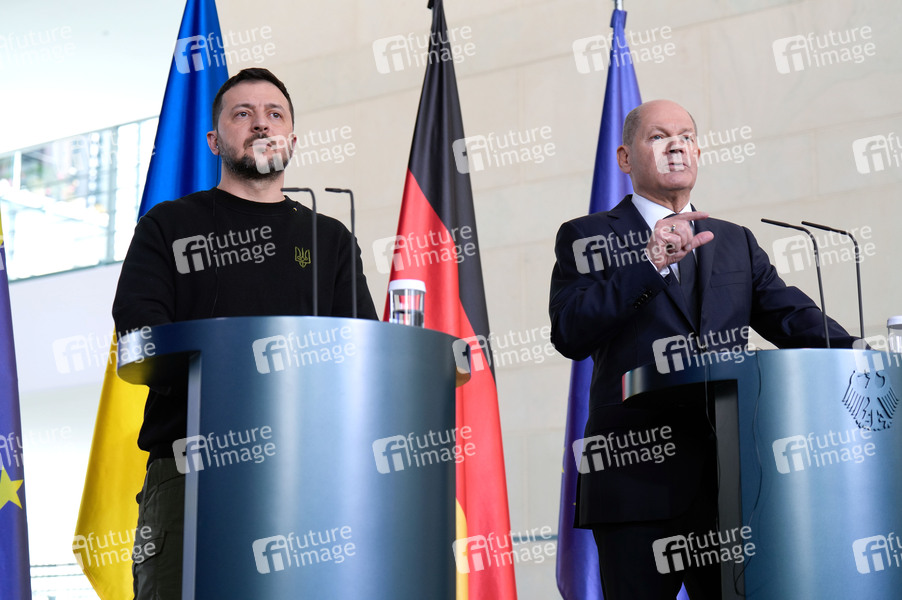 Politik, Staatsbesuch, Staatsvisite, Gespräch, bilaterale Gespräche, Treffen, Diplomatie, Staatsgast Kanzleramt, Ehrenhof, Pressekonferenz, Pressestatement, Unterstützung, Krieg, Politiker, Präsident der Ukraine, Volodymyr Zelenskyy, Bundeskanzler, SPD