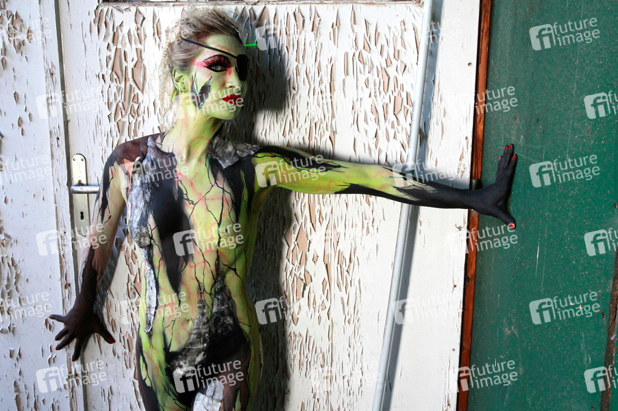 Bodypainting, Erotik, Frau, Mädchen, nackt, draußen, weiblich, Körperkunst, Kunst, Malerei, Augenklappe, erotic, woman, girl, nude, outdoor, female, body art, body painting, eyepatch