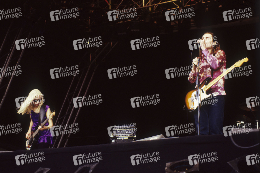 D'arcy Wretzky und Billy Corgan von Smashing Pumpkins live auf dem Reading Festival 1992 an der Richfield Avenue. Reading, 29.08.1992