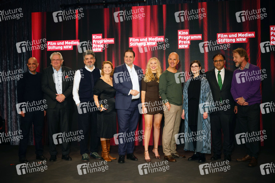 Regisseur Ali Samadi Ahadi, Bürgermeister Dr. Ralph Elster, Ehrenpreisträger Mustafa El Mesaoudi, Annette Frier, Minister für Medien des Landes Nordrhein-Westfalen Nathanael Liminski, Helena Zengel, Christoph Maria Herbst, Spitzenpreisträgerin Maria Minewitsch (Cinema & Kurbelkiste Münster), Filmstiftungs-Geschäftsführer Walid Nakschbandi und Sönke Wortman bei der 34. Verleihung der Kinoprogrammpreise NRW der Film- und Medienstiftung NRW in der olkenburg. Köln, 13.11.2024