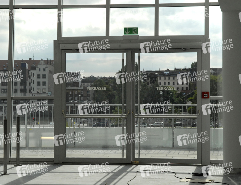 Terrasse, multifunktionale Veranstaltungshalle auf dem Gelände des ehemaligen Ostgüterbahnhofs, Halle, Multifunktionshalle, Arena, Grundsteinlegung erfolgte am 13. September 2006, Eröffnung 10. September 2008, Arenafläche 60.000 Quadratmeter, Höhe 35 Meter, 17.000 Sitzplätze