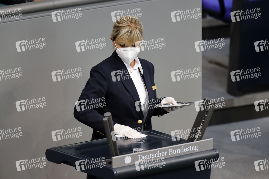 Bundestagssitzung, Politik, Reichstag, Sitzung, Regierung, Deutscher Bundestag, Debatte, Plenum, Plenarsitzung, Bundestagsdebatte, Rede, Demokratie, Abgeordnete, Parlament, Parlamentsgebäude, Bundesregierung, Volksvertreter, Saaldiener, Desinfektion, Reinigung, Corona