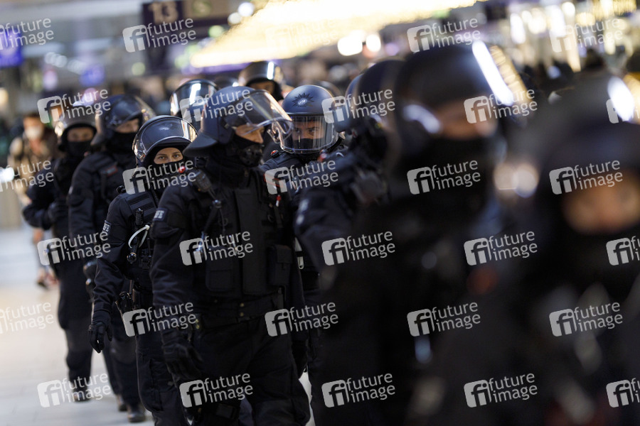 Polizisten sichern am Düsseldorfer HBF die An- und Abreise von Hooligans anlässlich der Querdenken-Demo im Rheinpark Golzheim. Düsseldorf, 06.12.2020