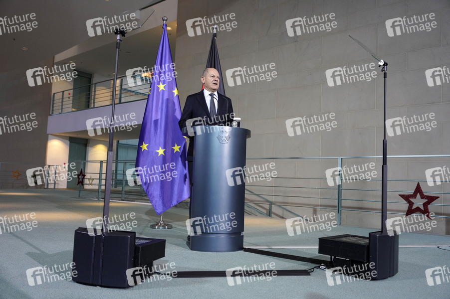 Olaf Scholz beim Pressestatement zu seinem formellen Antrag zur Vertrauensfrage im Bundeskanzleramt. Berlin, 11.12.2024