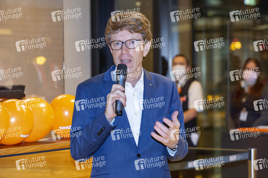 Engelbert Lütke Daldrup beim allerersten kommerziellen Abflug vom BER mit easyJet nach London Gatwick am Gate im Non-Schengen-Bereich des Terminal 1 im Flughafen Berlin Brandenburg. Schönefeld, 01.11.2020