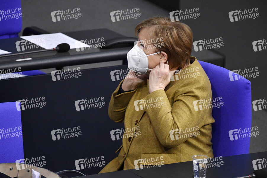 Angela Merkel in der 215. Sitzung des Deutschen Bundestages im Reichstagsgebäude. Berlin, 04.03.2021