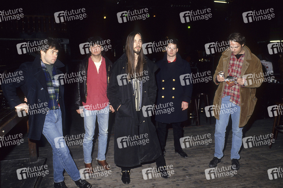 Gord Sinclair, Paul Langlois, Johnny Fay, Rob Baker und Gord Downie von The Tragically Hip bei einem Photoshooting im Kaiserkeller. Hamburg, 10.08.1990