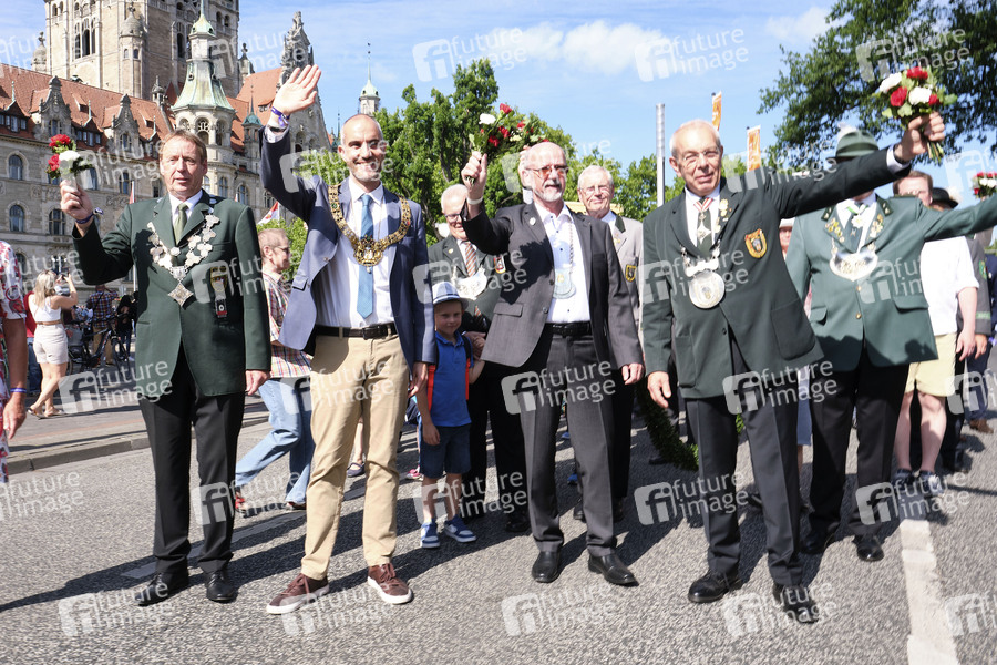 Wilfried Ritzke (Präsident des Niedersächsischen Sportschützenverbandes), Belit Onay (Oberbürgermeister Landeshauptstadt Hannover), Volker Kluwe (Polizeipräsident Hannover) und Paul-Eric Stolle (Präsident Verband Hannoverscher Schützenvereine) beim Schützenausmarsch zum 493. Schützenfest in der Innenstadt. Hannover, 03.07.2022