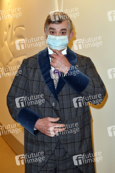 Dirk Schoedon beim Fototermin mit dem (getesteten) Ensemble des Theaterstücks 'Vorhang auf für Cyrano' in Maske und Kostüm vor dem Testzentrum im Schiller Theater. Unter dem Motto 'Testen statt spielen' eröffnen die Komödie am Kurfürstendamm und der KitKatclub ein gemeinsames Testzentrum im Schiller Theater. Berlin, 07.04.2021