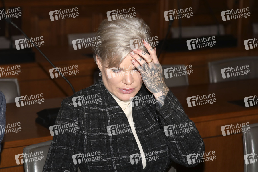 Melanie Müller beim Berufungsprozess wegen Verwendens von Kennzeichen verfassungswidriger und terroristischer Organisationen im Amtsgericht Leipzig. Leipzig, 18.12.2025