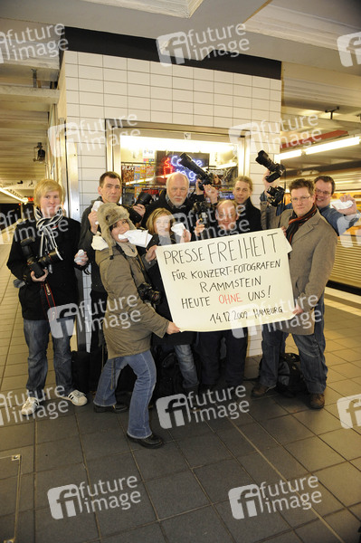 Hamburger Konzertfotografen boykottieren das Rammsteinkonzert am 14.12.2009 aufgrund von Knebelverträgen. Stellvertretend auch fuer viele weitere Kollegen trafen sich spontan die Fotografen Philipp Szyza (2-kameraden), Christian Fischer (Bühnenblicke), Rainer Merkel, Joerg-Martin Schulze (jms-photo), Carsten Schem (Concert Views), Marco Maas (Fotograffirma), Heiko Sehrsam (Pics Hamburg), Nicola Ruebenberg (Face To Face), Isabel Schiffler (Jazz Archiv), Markus Lubitz (Jazz Archiv) zum gemeinsamen Protestfoto. Der Vertag der Rammstein GbR reduziert u.a. die Verbreitungsmoeglichkeiten der Konzertfotos auf ein einziges, namentlich zu bezeichnendes Medium und beinhaltet, dass Rammstein die Bilder gratis für eigene Zwecke nutzen darf. Bildjournalistinnen und -journalisten sollen der Band gestatten, Fotos für die Nutzung auf Webpages von Rammstein oder dem Management der Band ohne gesonderte Verguetung nutzen.