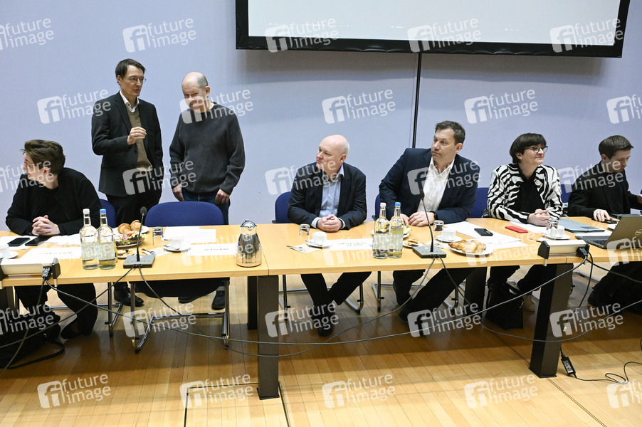 Klara Geywitz, Karl Lauterbach. Olaf Scholz, Achim Truger, Lars Klingbeil, Saskia Esken und Kevin Kühnert bei Beratungen im Rahmen einer Klausur des SPD-Parteivorstandes in der Landesvertretung Hamburg beim Bund. Berlin, 16.03.2024