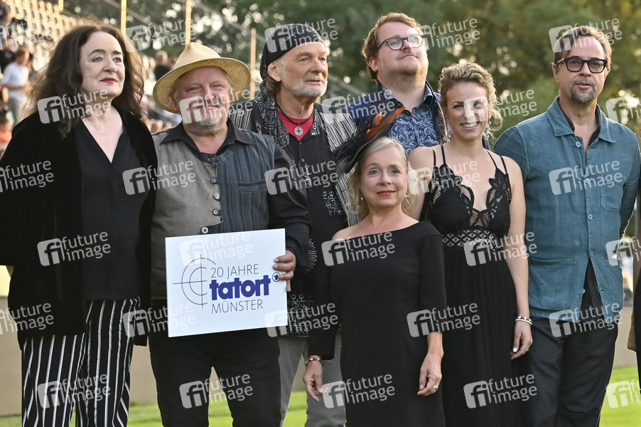 Mechthild Großmann, Axel Prahl, Claus Dieter Clausnitzer, ChrisTine Urspruch, Björn Meyer, Jannis Rattenni und Jan Josef Liefers bei der Premiere des ARD-Krimis 'Tatort - Ein Freund, ein guter Freund' zum 20 jährigen Jubiläum des Münsteraner Tatorts im Preußenstadion. Münster, 30.08.2022