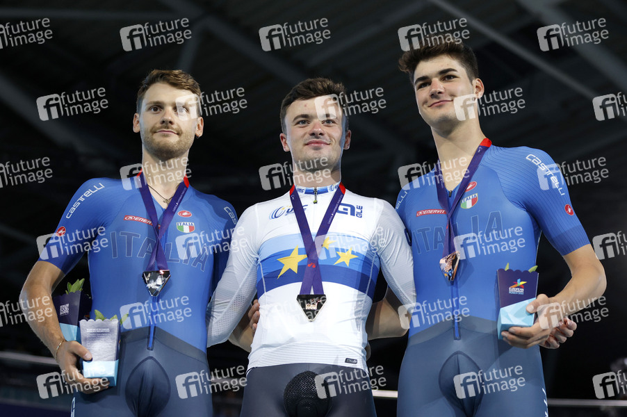 Davide Plebani, Nicolas Heinrich und Manlio Moro bei der Siegerehrung Finale Einerverfolgung Herren bei den European Championships 2022 im Bahnradsport in der Messe München. München, 13.08.2022