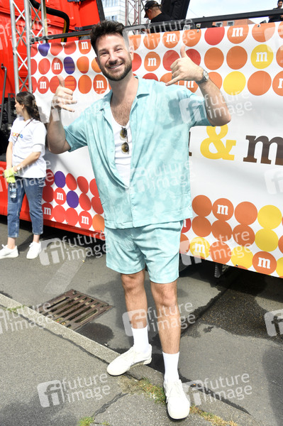 Alexander Schäfer vor dem M&M's Truck bei der 44. Christopher Street Day Parade 2022 unter dem Motto 'United in Love! Gegen Hass, Krieg und Diskriminierung' vom Spittelmarkt auf gut sieben Kilometern über Potsdamer Platz und Potsdamer Straße zum Nollendorfplatz, von dort weiter zur Siegessäule und zum Brandenburger Tor. Berlin, 23.07.2022