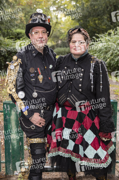 Andre Sielaff alias Lord Iron from Cologne und Edeltraud Kamp alias Freigesungen van Campen beim exklusiven Fotoshooting im Volksgarten mit Mitgliedern des 1. Steampunk Club Köln. Köln, 26.09.2020