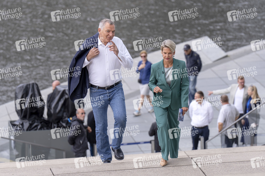 Jan van Aken und Anna Engelke beim ARD-Sommerinterview auf der Terrasse vom Marie-Elisabeth-Lüders-Haus. Berlin, 17.08.2025