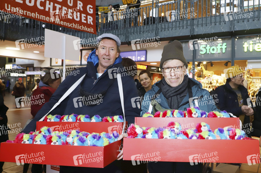 Lou Richter und Thorsten Laussch beim 28. Charity Teddybären Verkauf 2025 zugunsten von Leuchtfeuer im Hauptbahnhof Hamburg. Hamburg, 20.11.2025