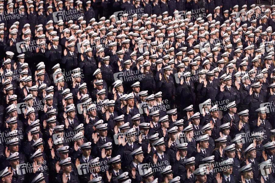 Vereidigung von neuen Kommissaranwärterinnen und Kommissaranwärtern samt traditionellem Mützenwurf in der Lanxess-Arena. Köln, 03.04.2019