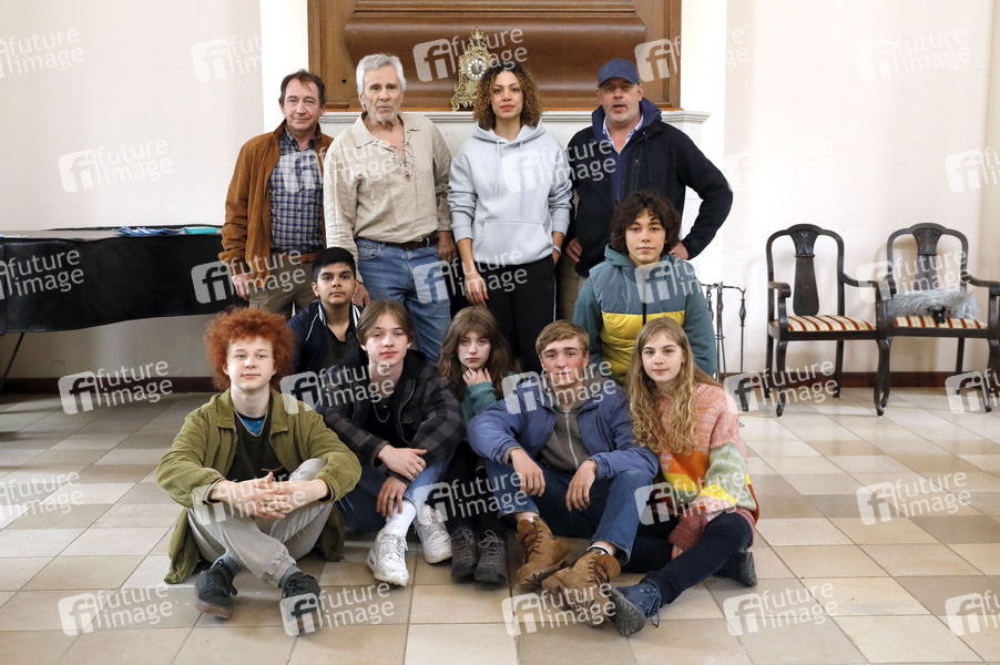 Stehend: Thorsten Merten, Gojko Mitic, Haley Jones und Mark Schlichter. Sitzend: Leopold Ferdinand Schill, Dennis Kharazmi, Egon Werler, Lisa Moell, Luis Vorbach, Ron Antony Renzenbrink und Leni Deschner beim Fototermin am Set des Kinofilms 'Alfons Zitterbacke - Chaos auf der Klassenfahrt' auf Schloss Ostrau. Ostrau, 21.10.2021