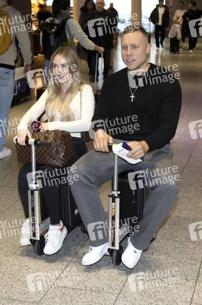 Patrick Romer mit Freundin Annelie Henze bei der Abreise der Dschungelcamp-Kandidaten der RTL Reality-TV-Show 'Ich bin ein Star - holt mich hier raus' nach Australien auf dem Flughafen Frankfurt am Main. Frankfurt, 17.01.2026