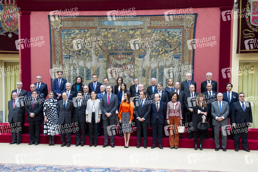 König Felipe VI. von Spanien und Königin Letizia von Spanien mit den Ehrenbotschaftern bei der Akkreditierungszeremonie der Ehrenbotschafter der Marke 'Spanien' im Palacio Real El Pardo. Madrid, 03.03.2020