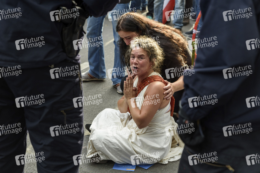 Coronaleugner, Verschwörungstheoretiker und rechte Gruppen der Initiative Querdenken protestieren mit einer Großdemonstration gegen die bestehenden Maßnahmen zur Eindämmung der Corona-Pandemie. Vor der russischen Botschaft an der Straße Unter den Linden kam es zu Auseinandersetzungen mit Polizeikräften. Wegen Nichteinhaltung der polizeilichen Auflagen wurde die Demonstration durch die Polizei beendet. Berlin, 29.08.2020