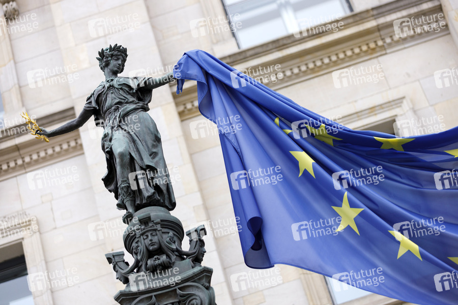 Eine Europa-Flagge, mit ihrem Kranz aus zwölf goldenen fünfzackigen Sternen, hat sich in einer Statue am Reichstag verfangen. (Themenbild, Symbolbild) Berlin, 01.04.2021
