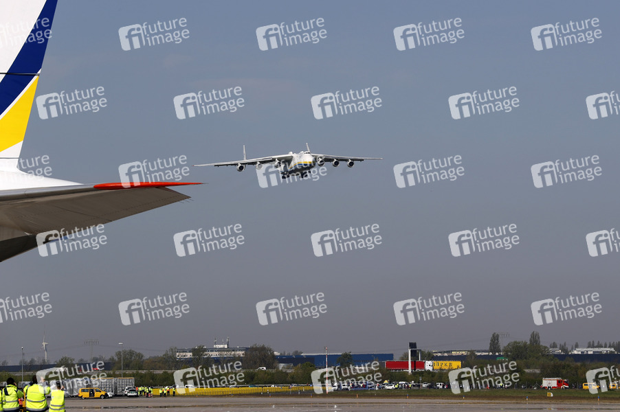 Ankunft einer Antonow 225 mit einer Lieferung von Schutzmaterial aus China auf dem Flughafen Leipzig/Halle. Mehr als zehn Millionen Schutzmasken kommen als Bundeswehr-Transport mit einer Antonow 225, dem größten und schwersten Frachtflieger der Welt, aus dem chinesischen Tianjin. Das Bundesministerium der Gesundheit hatte sich Anfang April mit der Bitte um Unterstützung beim Transport von Schutzausstattungen an das Bundesministerium der Verteidigung gewandt. Leipzig, 27.04.2020