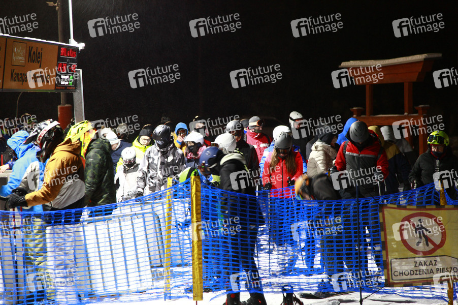 Großer Menschenandrang bis zum Abend auf den Skipisten im niederschlesischen Karpacz (Krummhübel), einen Tag vor dem harten Lockdown in Polen (28.12.2020-17.01.2021). Karpacz, 27.12.2020