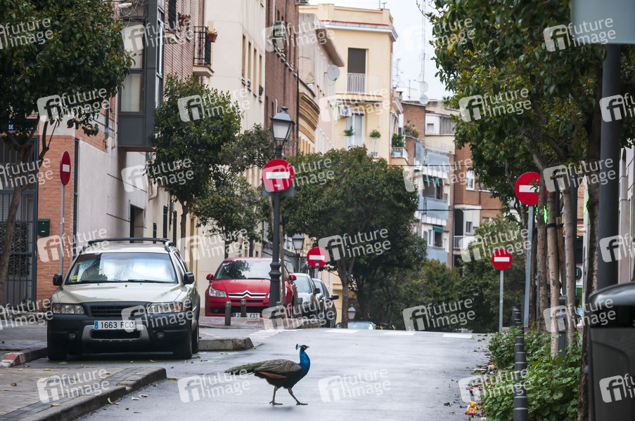 Pfauen unterwegs auf menschenleeren Straßen am Tag 17, nachdem die spanische Regierung den Ausnahmezustand wegen des Coronavirus COVID-19 erklärt hat. Die Bevölkerung steht vorerst bis zum 11. April Tage zu Hause unter Quarantäne. Die spanische Polizei und Armee überprüfen Menschen, die durch die Straßen gehen. Erlaubt sind Gänge in Krankenhaus, in Supermärkte, Kioske und Apotheken, sowie das Ausführen von Haustieren und der Weg zur Arbeit. Madrid, 01.04.2020