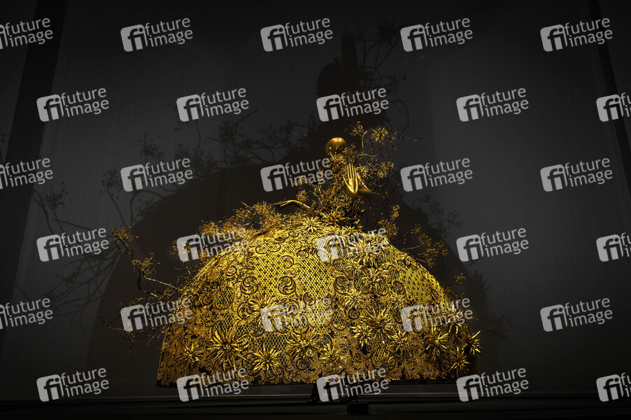Eines der Kleider von Guo Pei aus der Ausstellung in der M+ Gallery in Hongkong. Die Ausstellung dauert bis April 2025. Guo Pei ist die renommierte chinesische Haute-Couture-Designerin, die für ihre komplizierten, opulenten Designs gefeiert wird, die traditionelle chinesische Handwerkskunst nahtlos mit moderner Mode verbinden. Guo Pei ist bekannt für ihre atemberaubend detailreichen Kreationen, darunter das ikonische gelbe Kleid, das Rihanna bei der Met Gala 2015 trug, und wurde 2010 das erste asiatische Mitglied der Chambre Syndicale de la Haute Couture, was ihren Platz auf der globalen Modebühne festigte. Hongkong, 21.09.2024