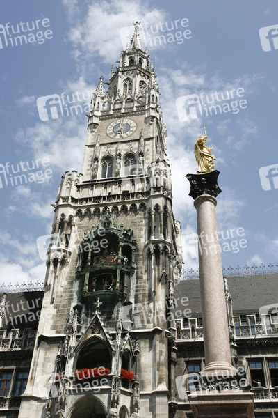 Marienplatz, Sitz des Oberbürgermeisters und der Stadtverwaltung, erbaut 1867 bis 1909 von Georg von Hauberrisser, Neugotik, der 85 m hohe Rathausturm mit dem Münchner Kindl an der Turmspitze enthält das fünftgrößte Glockenspiel Europas, 43 Glocken, 400 Zimmer