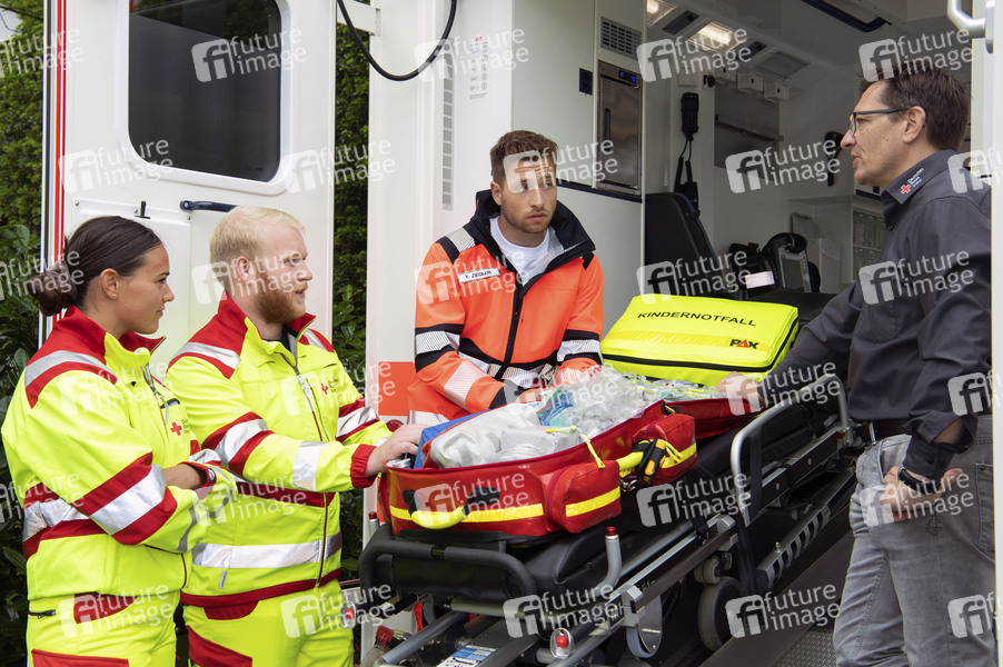 Dominik Flade mit Rettungssanitäter-Azubis Dana Odendahl und Moritz Abel und Ausbildungsleiter Wolfgang Brühll bei einem Fototermin mit dem dem Deutschen Roten Kreuz e.V. am Set der RTL TV-Serie 'Alles was zählt' in den MMC-Studios in Ossendorf. Der AWZ-Schauspieler bereitet sich mit Hilfe des DRK auf seine Rolle des Rettungssanitäters vor. Köln, 23.06.2021