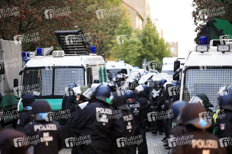Die Berliner Polizei hat das Wohnprojekt Liebig34 in Berlin-Friedrichshain geräumt. Polizisten verschafften sich Zugang zu dem Haus führten nach und nach die Bewohnerinnen heraus. Die Berliner Polizei war mit 1500 Beamten im Einsatz. Vor dem Haus kam es zu Demonstrationen. Berlin, 09.10.2020