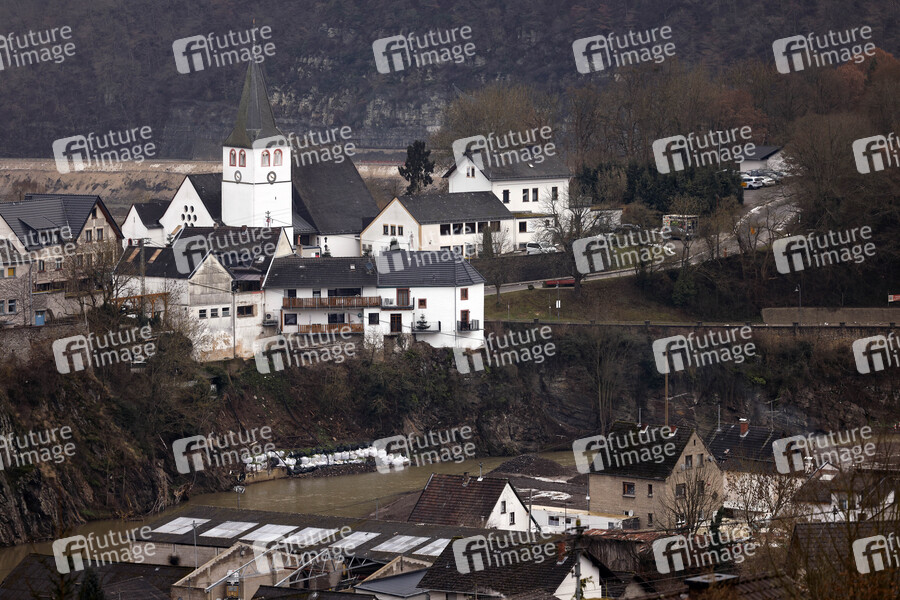Sechs Monate nach der Jahrhundertflut im Ahrtal ist der Wiederaufbau in der damals schwer getroffenen Ortsgemeinde Schuld weit vorangeschritten. Immer noch sind manche Häuser aber zerstört und es führen stellenweise provisorische Brücken über die Ahr. Schuld, 12.01.2022