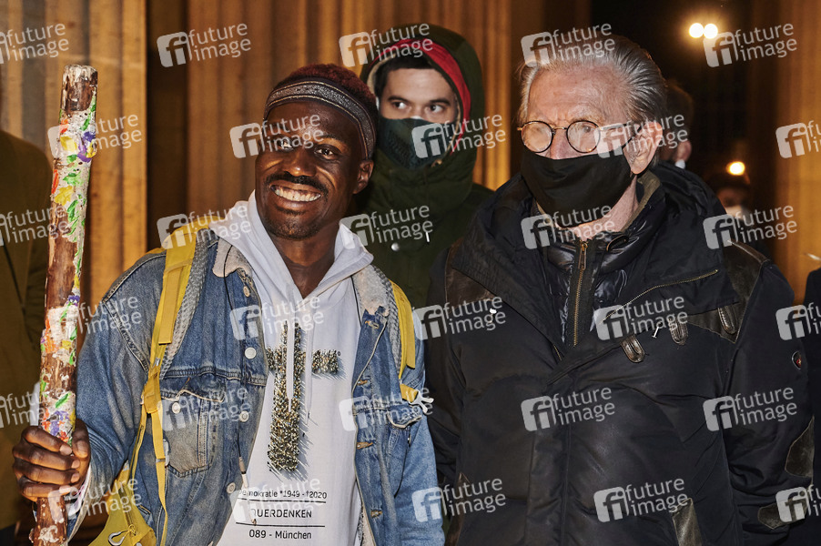 Jügen Todenhöfer mit Querdenken-Youtuber Nana Domena. Jürgen Todenhöfer tritt nach 50 Jahren Mitgliedschaft, zu seinem 80. Geburtstag, aus der CDU aus und gründet seine eigene Partei TEAM TODENHÖFER. Bei einer Kundgebung unter dem Motto 'Gemeinsam für Ehrlichkeit und Gerechtigkeit! Deutschland hat bessere Politiker verdient' hat Todenhöfer sein Parteiprogramm zur Bundestagswahl vor etwa 100 Fans am Brandenburger Tor vorgestellt. Berlin, 12.11.2020