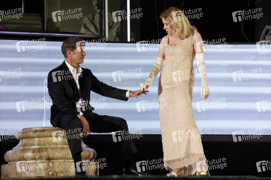 Tobias Moretti und Caroline Peters bei der Fotoprobe zum Theaterstück 'Jedermann - Das Spiel vom Sterben des reichen Mannes' bei den Salzburger Festspielen 2020 auf dem Domplatz. Salzburg, 29.07.2020