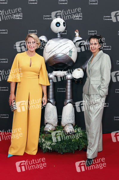 Judith Rakers, Rozzum 7134 und Malika Rabahallah bei der Premiere des Animationsfilms 'Der wilde Roboter / The Wild Robot' auf dem 32. Filmfest Hamburg 2024 im Cinemaxx Dammtor. Hamburg, 27.09.2024