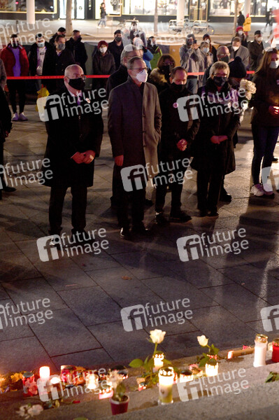 Michael Müller beim stillen Gedenken an die Opfer des islamisitischen Terroranschlags vom 19.12.2017 vor niedergelegten Kränzen mit 12-maligem Glockenschlag um 20.02 Uhr am Mahnmal 'Der Riss' auf dem Breitscheidplatz. Berlin, 19.12.2020