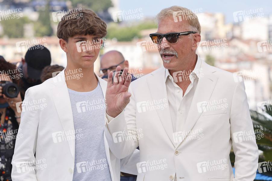 Hayes Costner mit Vater Kevin Costner beim Photocall zum Kinofilm 'Horizon: An American Saga' auf dem Festival de Cannes 2024 / 77. Internationale Filmfestspiele von Cannes am Palais des Festivals. Cannes, 19.05.2024