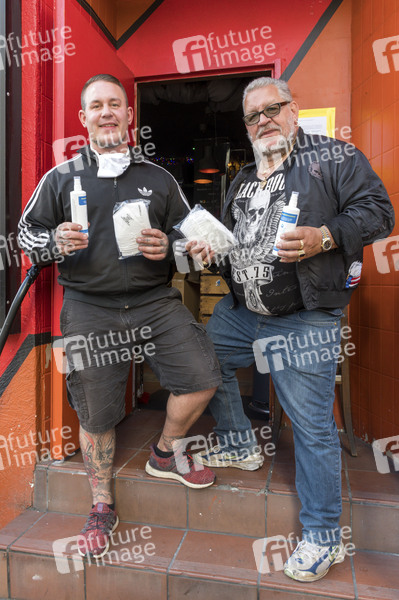Daniel Schmidt und Kalle Haverland bei der Verteilung von 1.000 Stück FFP2 Schutzmasken und 1.000 Fläschchen Desinfektionsmittel in Kooperation mit Riedel Schmiermittel und HDS GaLaBau an Hilfsbedürftige auf dem Kiez St. Pauli. Hamburg, 30.05.2020