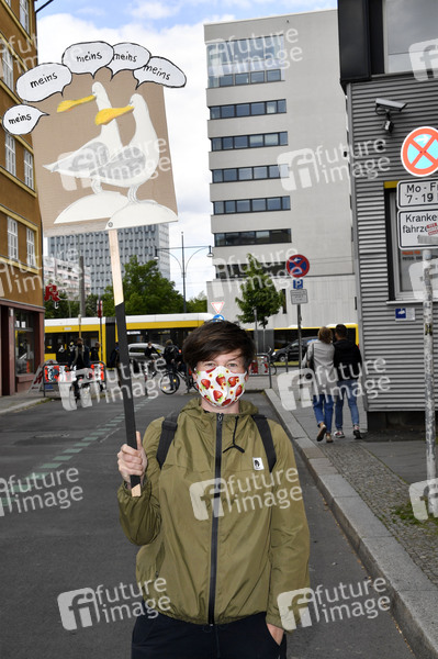 Demonstrantin bei einer 'Corona' Demonstration am Alexanderplatz. Am Samstag sind rund um den Rosa-Luxemburg-Platz mehrere 'Hygienedemos' und Gegenproteste geplant. Am Alexanderplatz sollen ab 14 Uhr insgesamt zehn Kundgebungen starten. Berlin, 16.05.2020